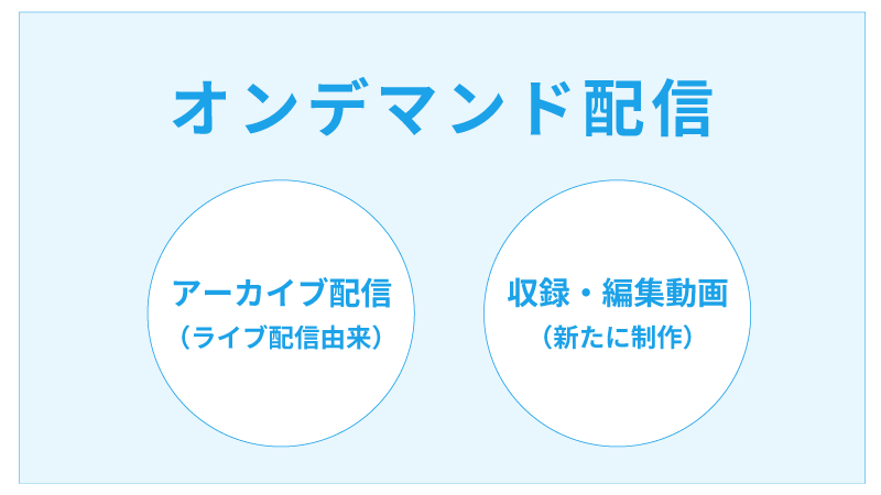 - オンデマンド配信: 事前に制作・編集した動画を、視聴者が好きな時に視聴できる形式。「ビデオ・オン・デマンド(VOD)」とも呼ばれる。