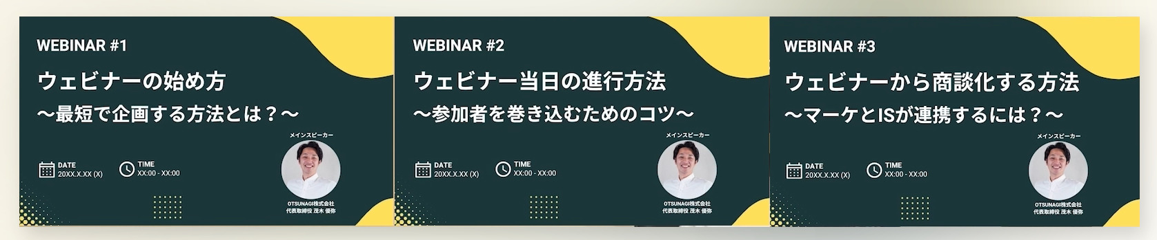 ウェビナーごとにデザイン・雰囲気に違いを出しつつも「この会社らしさ」が感じられる一貫性を保っています。完全なテンプレート化ではなく、柔軟な一貫性がポイントです。