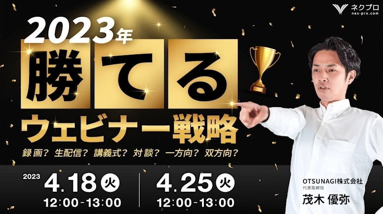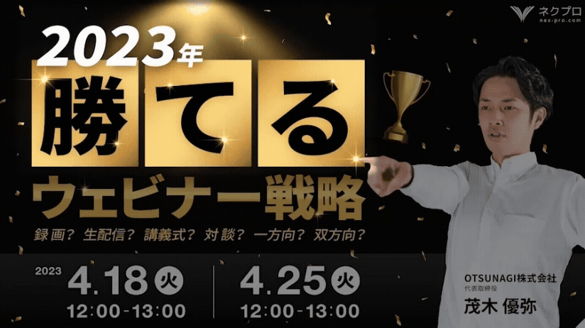 デザインのポイント: タイトルだけでなく、視覚的なシンボル(トロフィー)を加えることで、「このウェビナーに参加すれば勝てるノウハウが学べる」というメッセージを強化しました。