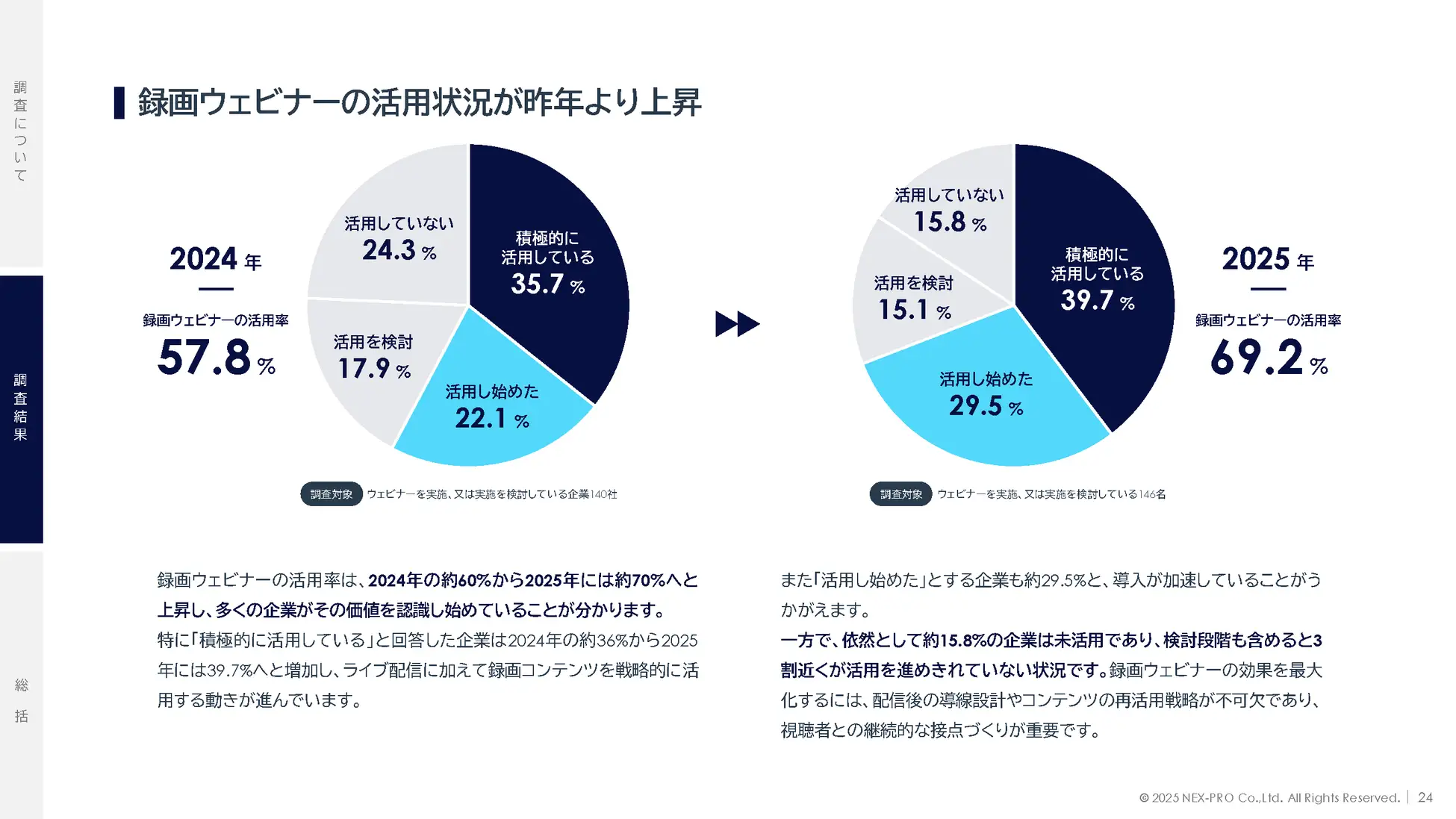 また、録画ウェビナーを『積極的に活用している』または『活用し始めた』企業は69.2%に達しており、アーカイブ活用がスタンダードになっています。