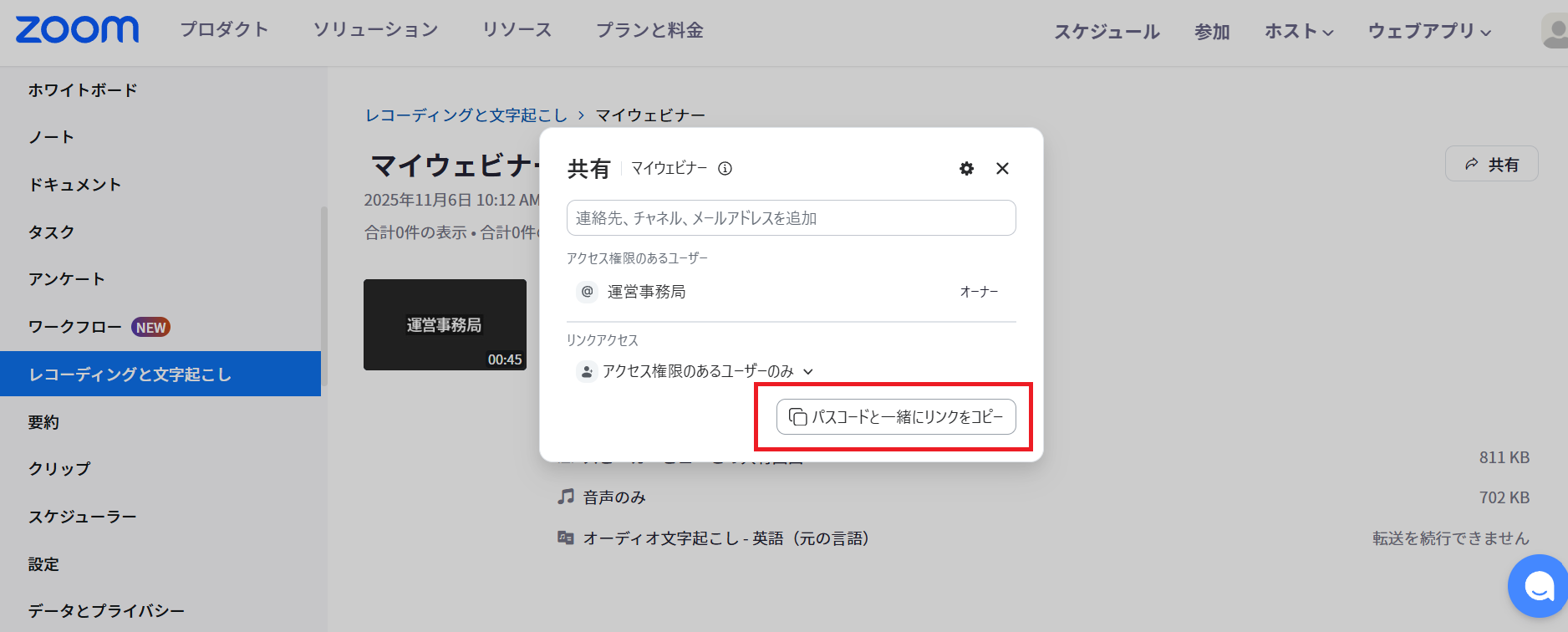 設定が完了したら、「リンクをコピー」または「パスコードと一緒にリンクをコピー」をクリックし、サンクスメール等で貼り付けて配信します。文面には「視聴期限:〇月〇日まで」「本動画の録画・再配布は禁止です」と改めて明記しましょう。