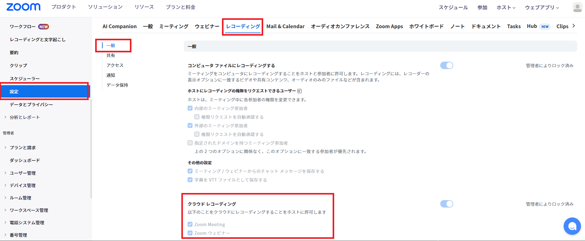 1,Zoomウェブポータルにログイン: ブラウザからZoomにサインインし、「設定」>「一般」>「レコーディング」>「クラウド レコーディング」を開きます。