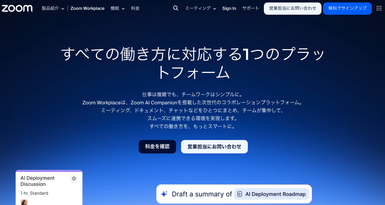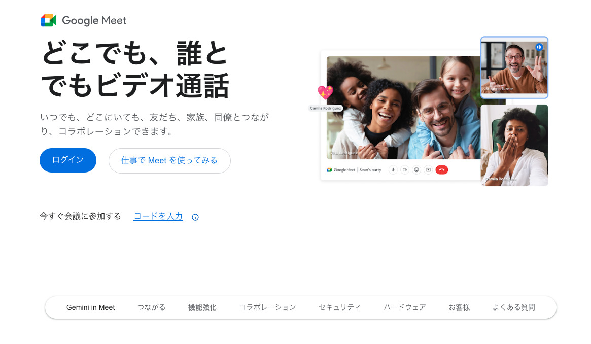 Google Workspaceの一部として提供される、Googleのビデオ会議ツールです。Googleアカウントさえあれば誰でも利用でき、ブラウザベースで動作するため、アプリのインストールも不要です。