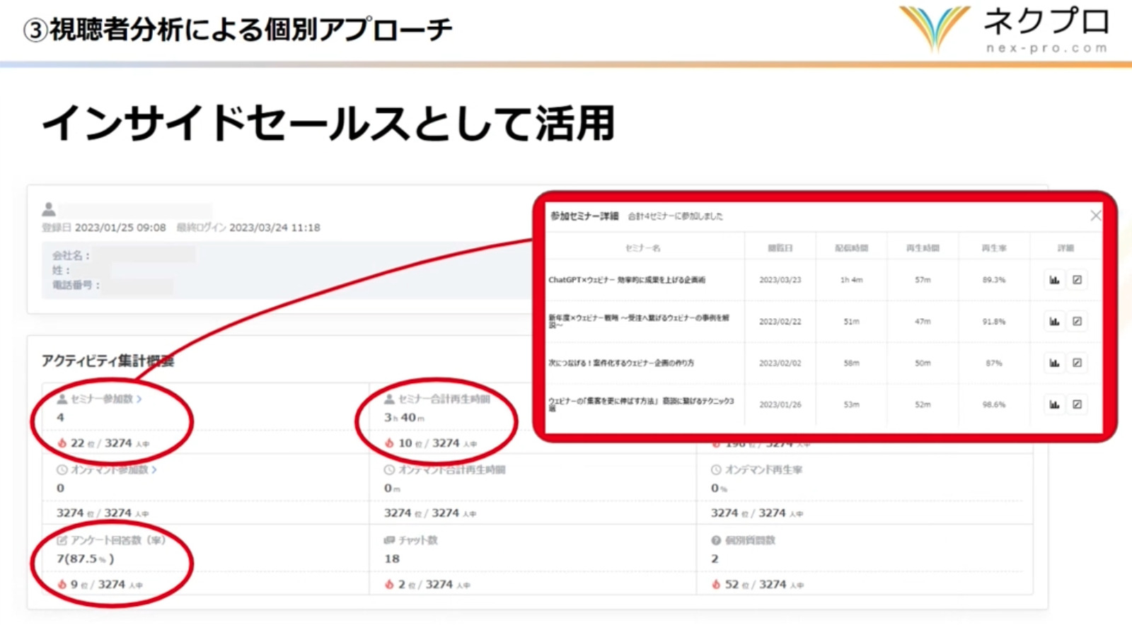 ネクプロでは、会員ごとのアクティビティを詳細に分析できます。これまで参加したセミナーの数・チャットへの投稿数・ホットリード判定スコアなどのデータが一元管理されており、ウェビナー終了直後に優先して架電すべき参加者を素早く特定することが可能です。