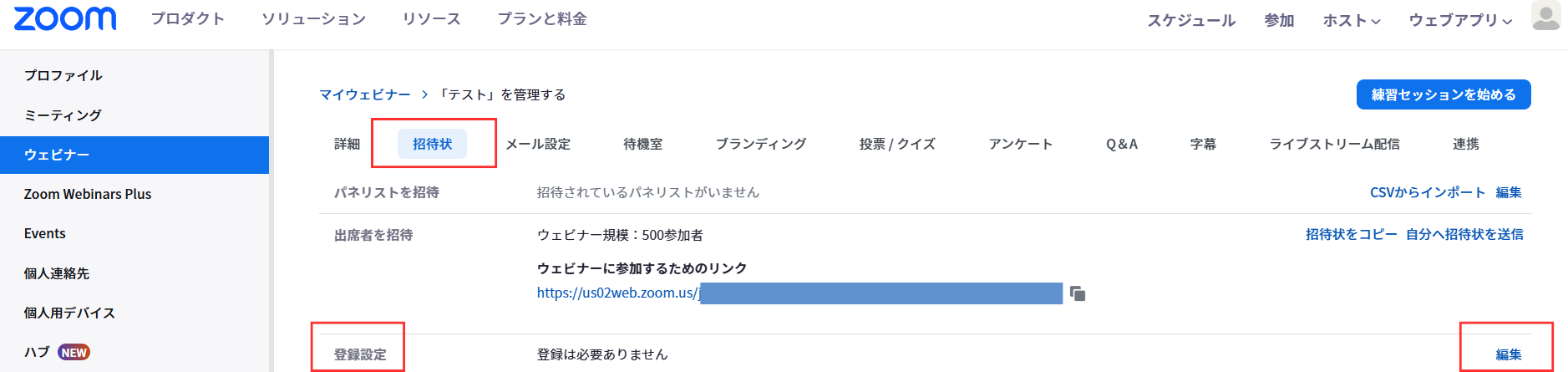 1、スケジュールしたウェビナーの詳細ページを開き、「招待状」タブを選択します。