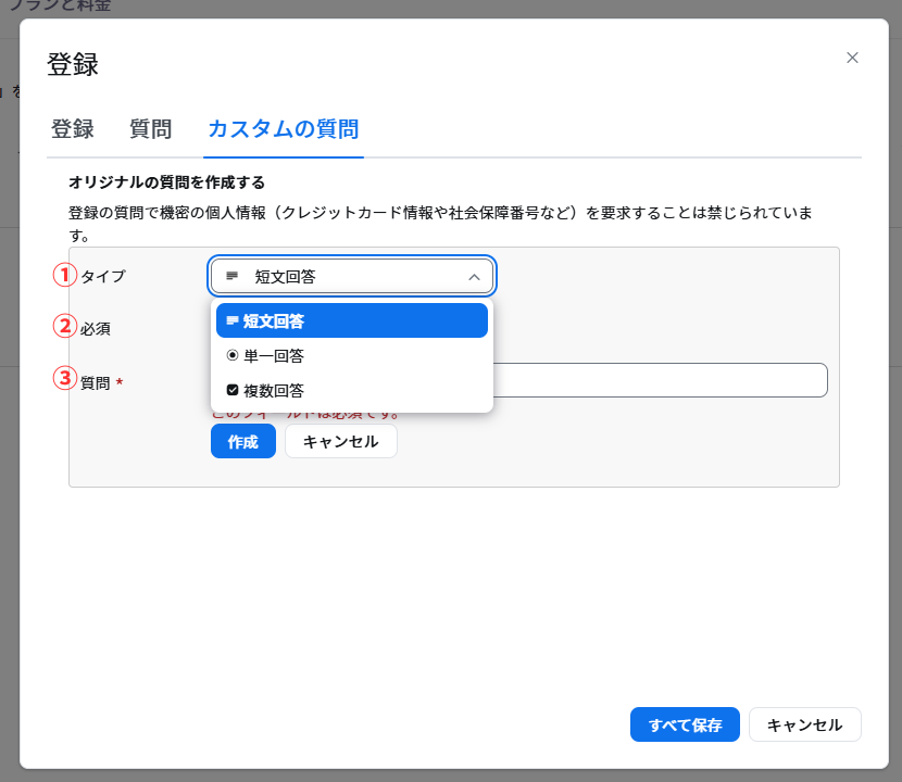 | ①タイプ | 短文回答 | ②必須 可否選択 | ③質問→回答フリー記載 | 1つの質問に対してテキスト入力で回答する形式 |