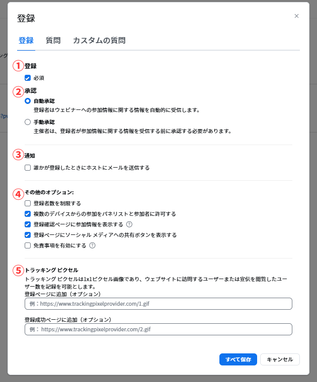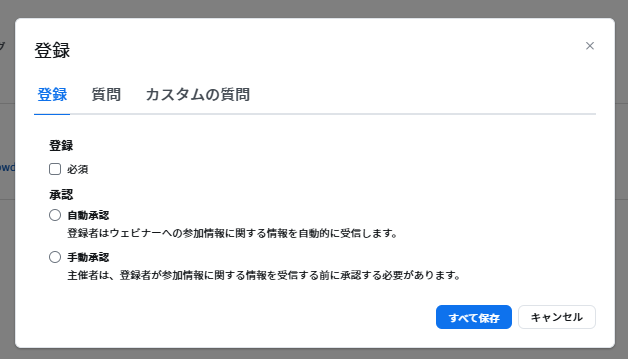 | ②承認 | 自動承認 | 登録者はウェビナーへの参加情報に関する情報を自動的に受信 |