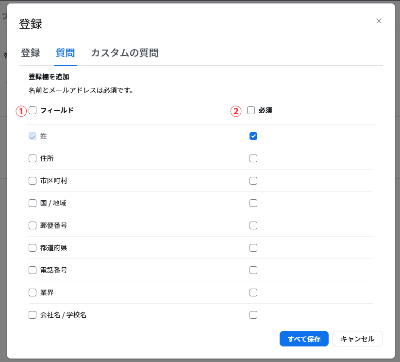 | ①登録 | 必須にチェックあり 参加者に登録フォームへの入力を必須 | |