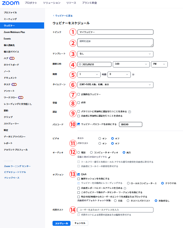 | ⑩パスコード | チェックあり ウェビナー パスコードを必須にする | |