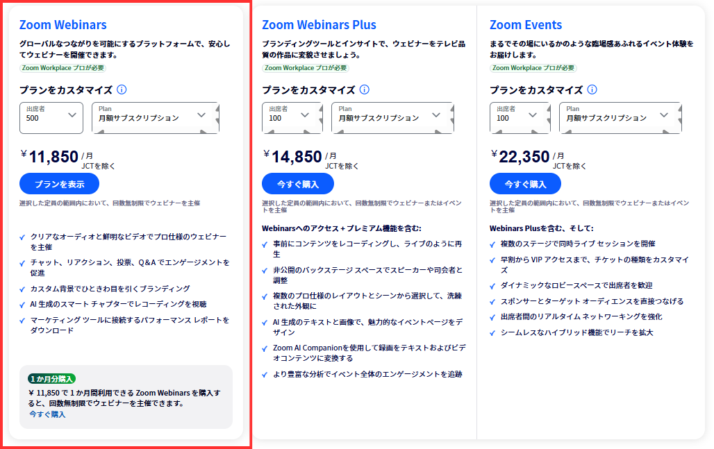 Zoomウェビナーのライセンスプランは以下の通りです。