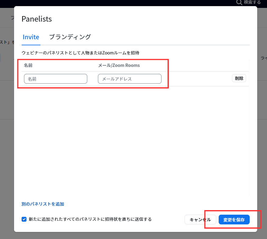 2、パネリストの名前とメールアドレスを入力し、招待状を送信します。この招待状には、パネリスト専用の参加URLが自動的に含まれています。パネリストは、このURLからウェビナーに参加できます。