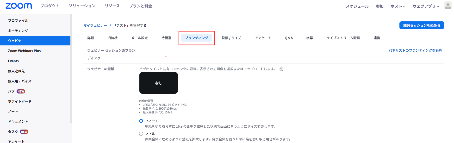 | ウェビナーの壁紙 | フィット | ビデオタイルと共有コンテンツの背後に表示される画像を選択またはアップロード 壁紙を切り取らずに 16:9 の比率を維持した状態で画面に合うようにサイズ変更が可能 画像の要件:JPEG / JPG または 24 ビット PNG推奨サイズ: 1920*1080 px最大画像サイズ: 15 MB |