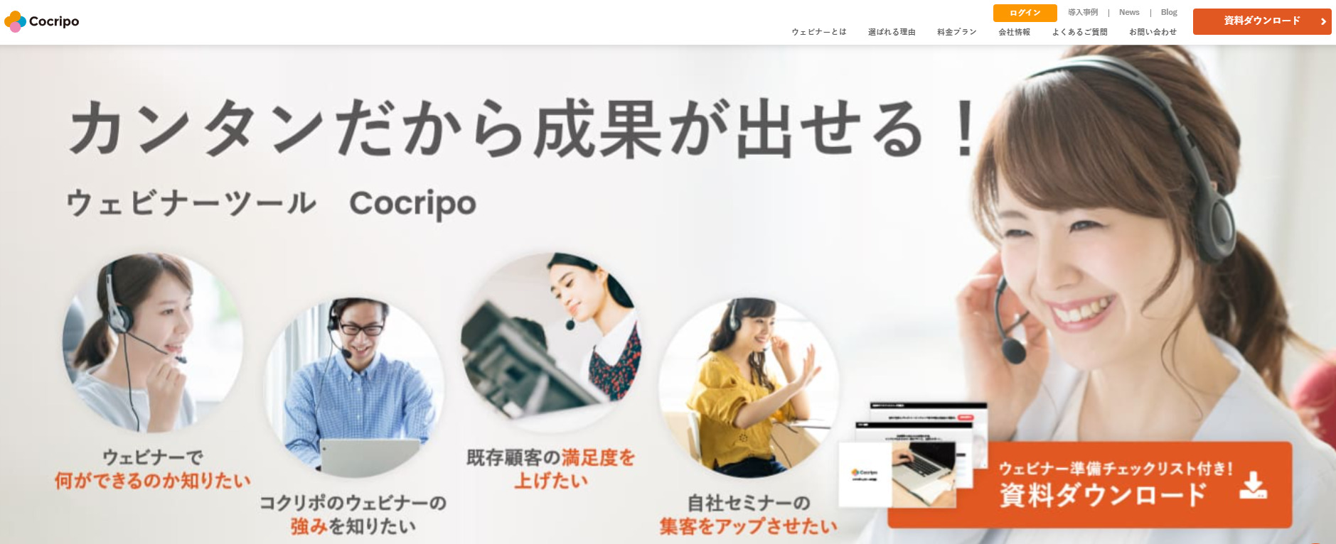 | コクリポ | シンプルで使いやすい国産ウェビナー専用ツール | 申込フォーム、匿名参加、匿名チャット機能 | 少人数から中規模のウェビナーを気軽に行いたい企業 |