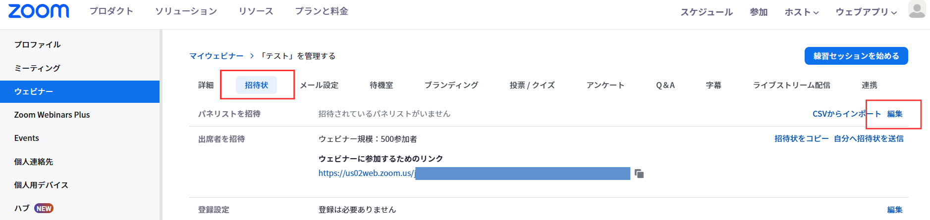 「パネリストを招待」セクションにある「編集」ボタンをクリックします。