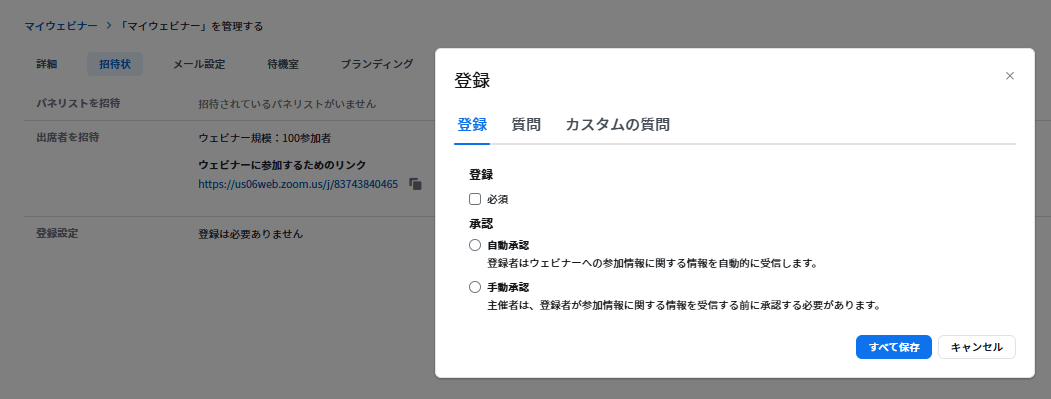 主催者が一人ひとり確認して許可を出します。競合他社の排除や、有料セミナーの入金確認後に承認する場合に使用します 1。 - 通知