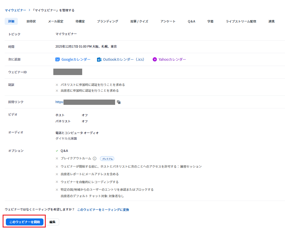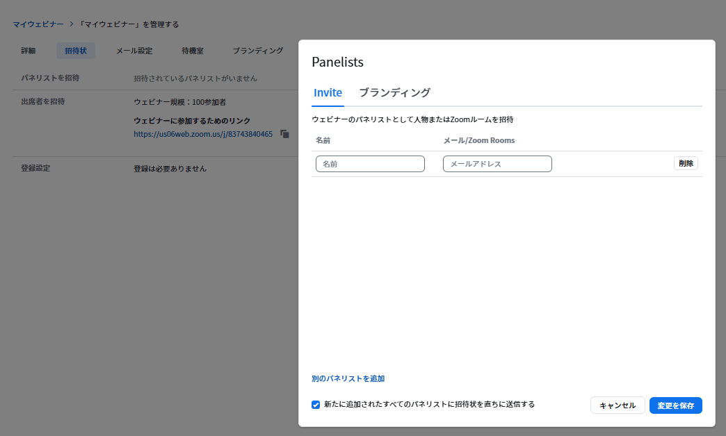 check💡保存すると、パネリスト専用の参加URLが記載された招待メールが自動送信されます。このURLは個別に発行されるため、他者と共有しないよう本人に伝えてください。