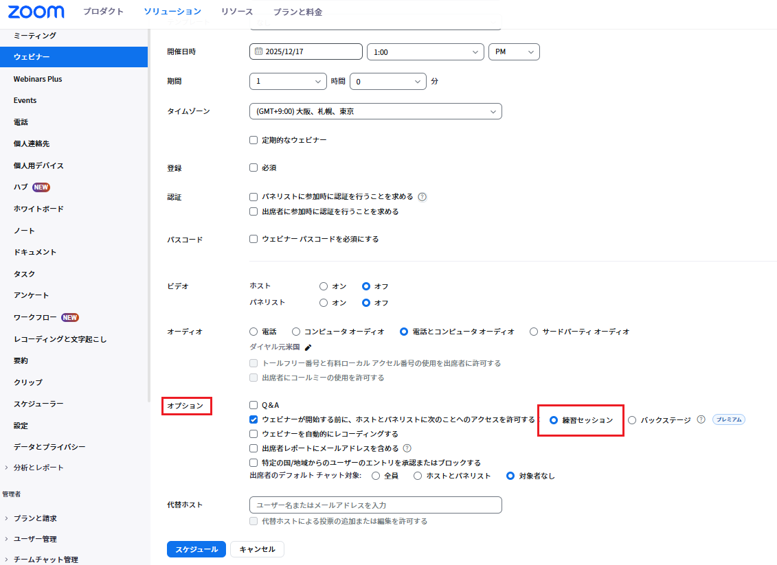 1.「ウェビナーをスケジュール」から「オプション」で「練習セッション」にチェックを入れてください。