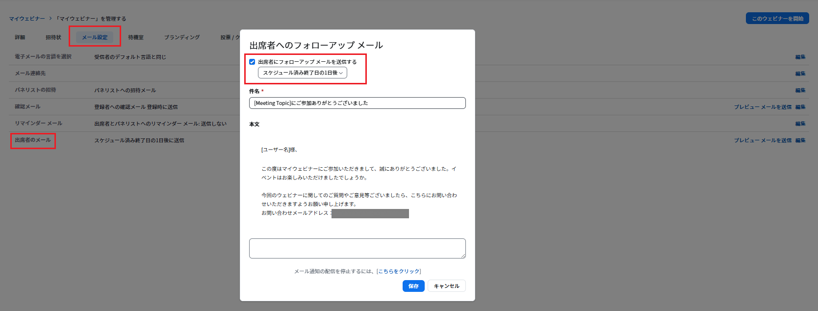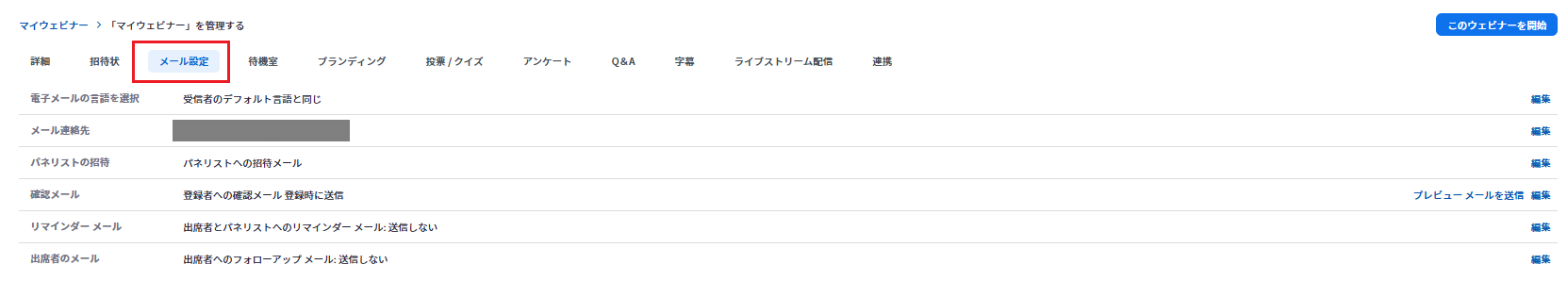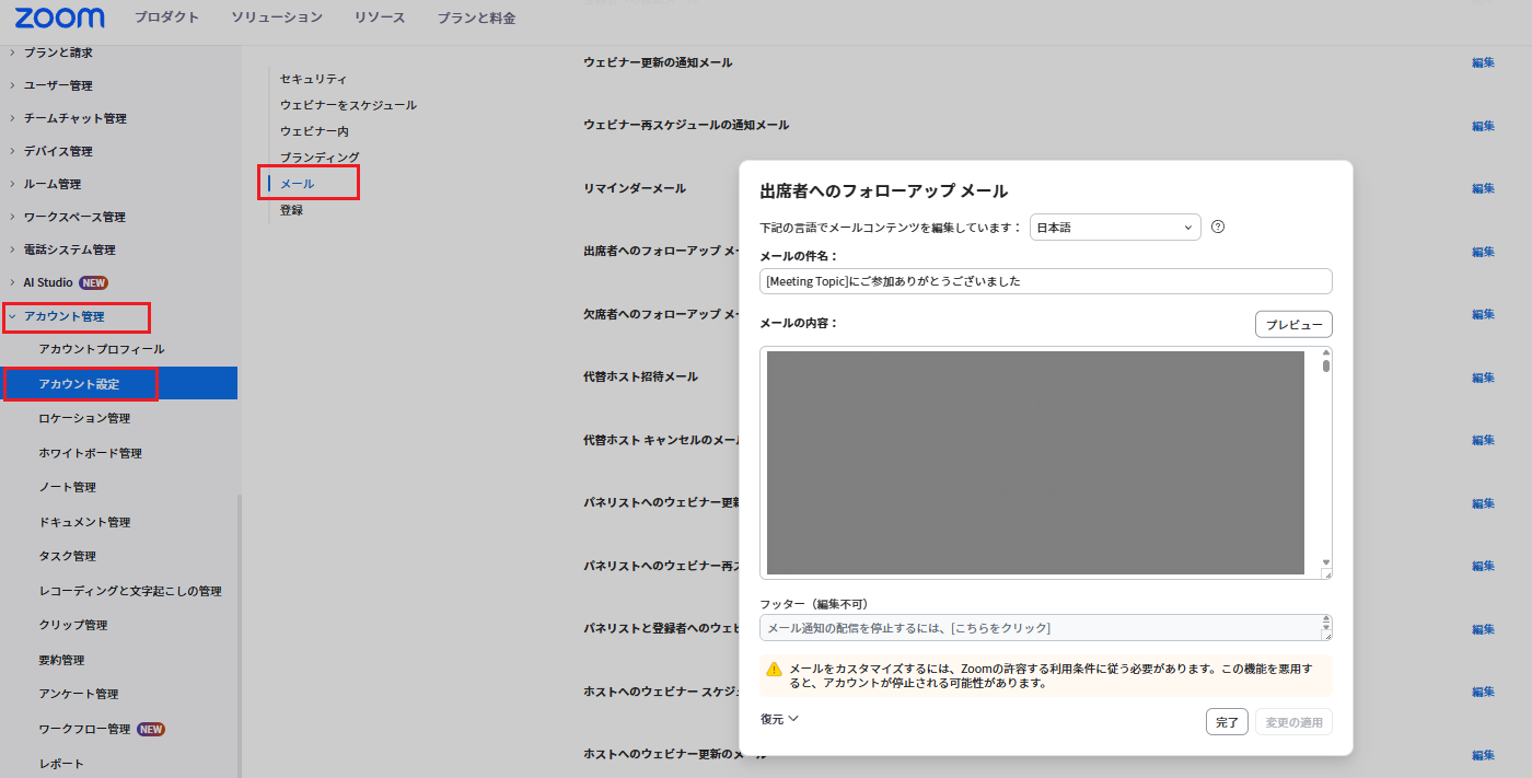 2.送信内容の変更に関しては、「アカウント管理」>「アカウント設定」>「ウェビナー」> 「メール」から、該当のメールテンプレート編集を選択してください。