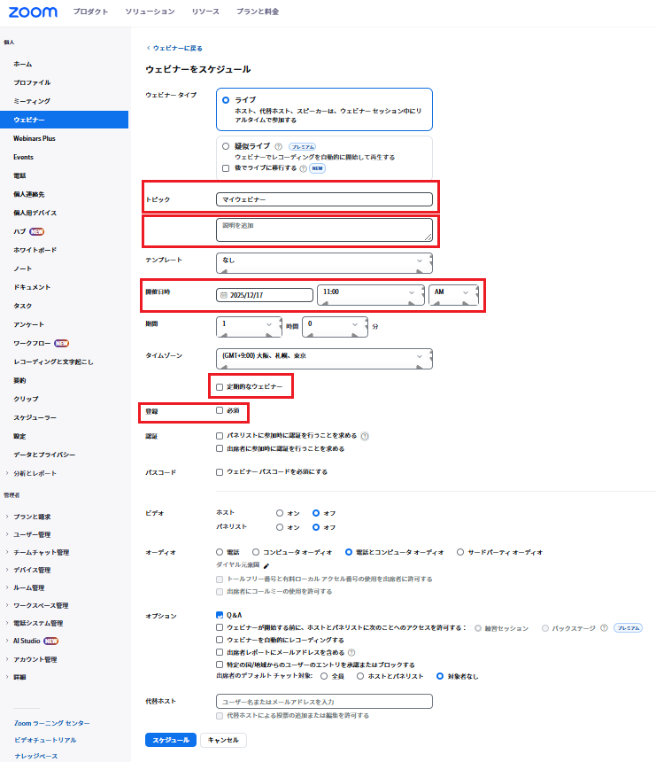 日付、時間、所要時間を設定します。特に「タイムゾーン」が「大阪、札幌、東京(GMT+9:00)」になっていることを必ず確認してください。海外の参加者がいる場合は、彼らのタイムゾーンに合わせて表示させる設定も可能です。 - 定期的なウェビナー