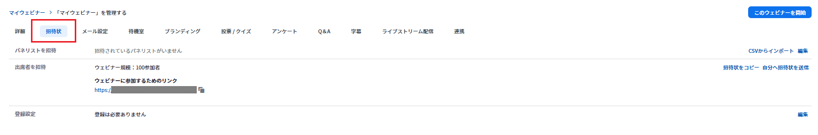 ホストが管理画面から参加者の「参加URL」をコピーし、個別にメールやチャットツールで送付してください。ただし、このURLは個別のトークンを含むため、SNSなどで拡散しないよう注意が必要です。