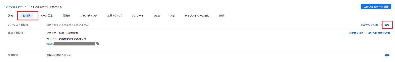 1.スケジュール管理画面の上部にある「招待状」タブをクリック、「パネリストを招待」の「編集」をクリックします。