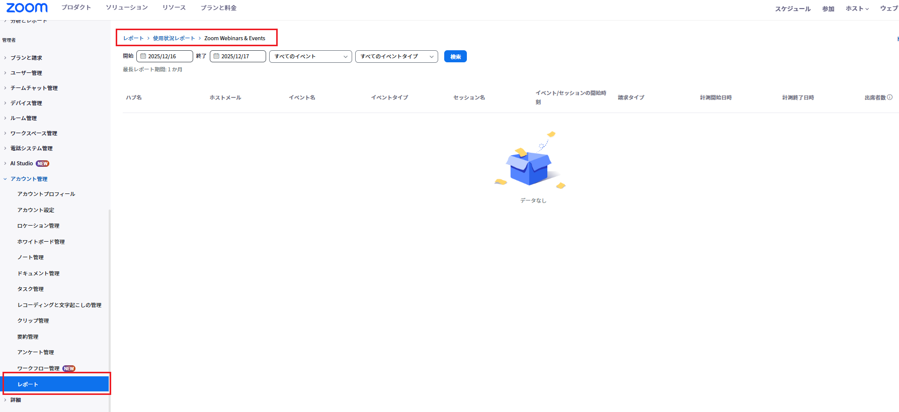 1.イベント終了後、Zoomウェブポータルの「アカウント管理」>「レポート」>「ウェビナー」セクションにアクセスします。以下のレポートがCSV形式でダウンロード可能です。