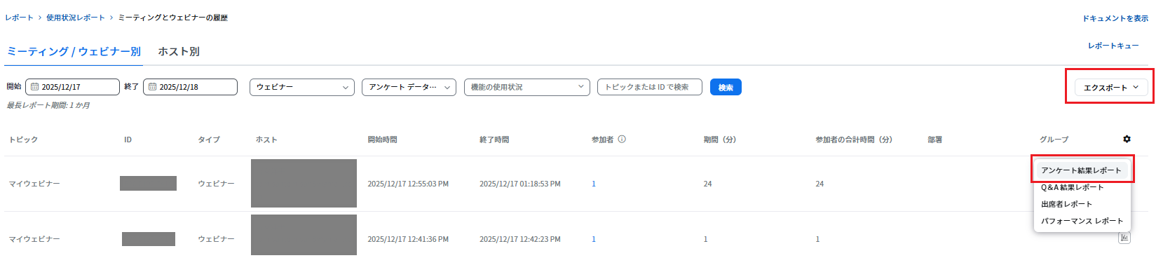1.イベント終了後、Zoomウェブポータルの「アカウント管理」>「レポート」>「ウェビナー」「アンケート結果レポート」を選択し、「エクスポート」をクリックします。