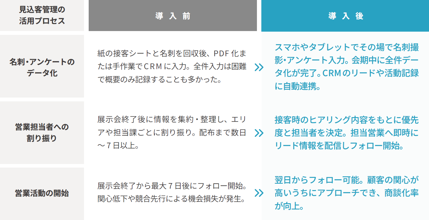 名刺とアンケートの情報共有と各部署での担当振分けが遅れ、潜在顧客の関心低下により商談につながる機会を活かしきれていなかった。