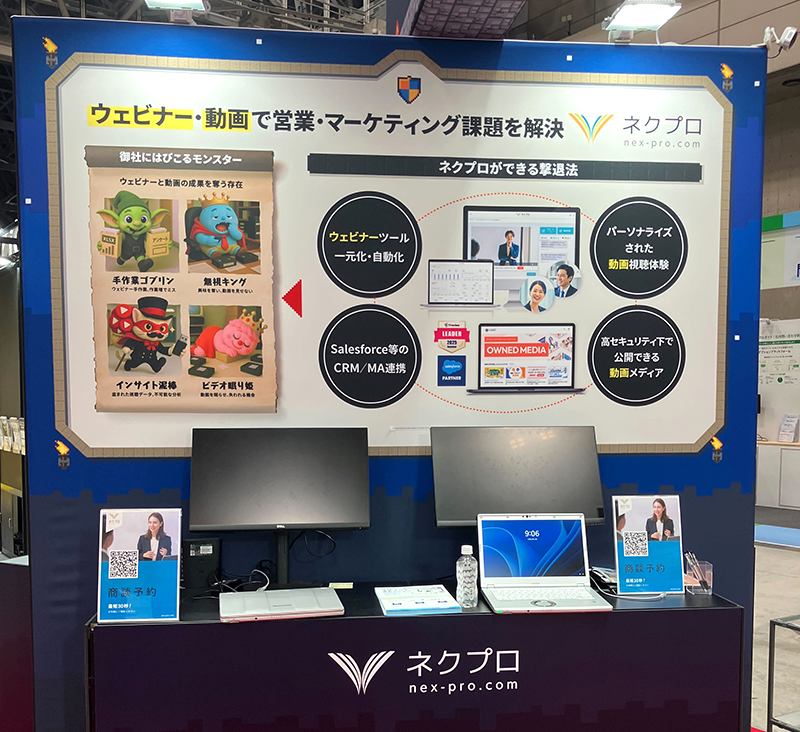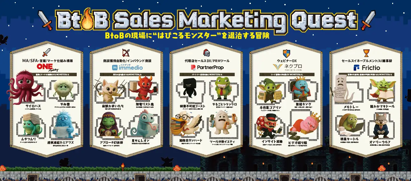 今回は「BtoB Sales Marketing Quest」をテーマに、ネクプロ、ワンマーケティング、immedio、パートナープロップ、SYSLEAの5社による共同ブース。来場者自身を「勇者」に見立て、BtoB企業の成長を阻むさまざまな"課題モンスター"を、各社が得意とする課題解決で討伐する体験型ブースとして展開しました。